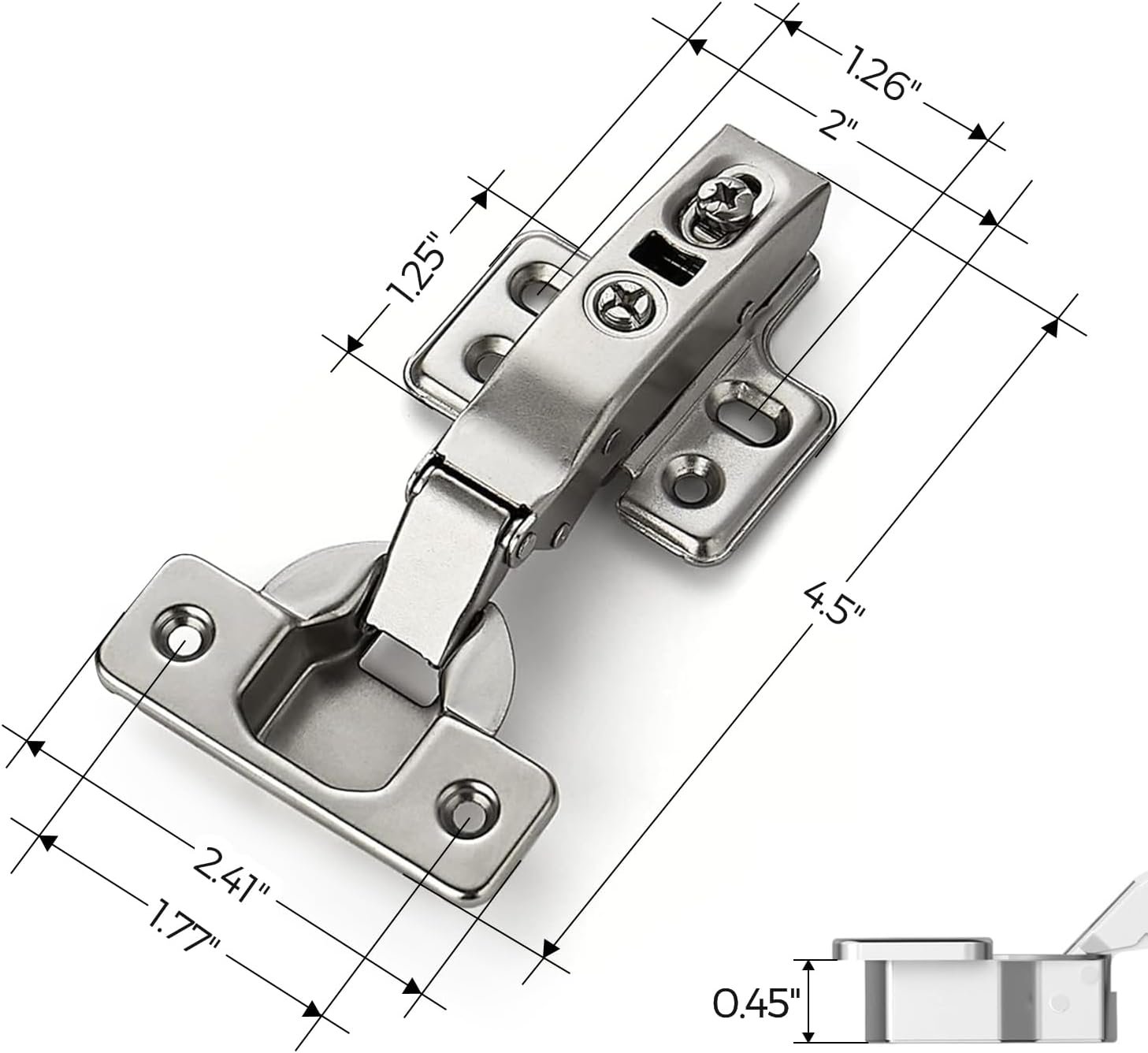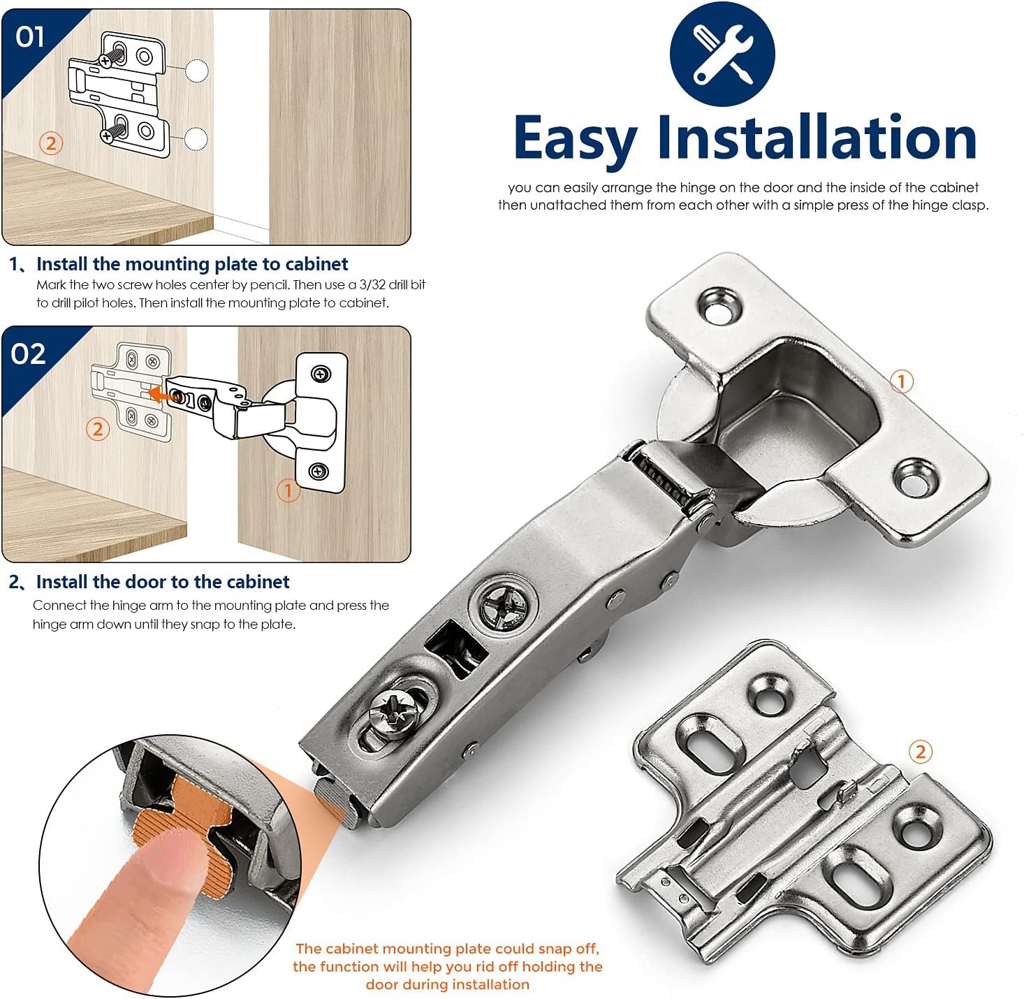 - Easy Installation: The cabinet mounting plate easily detaches, allowing you to position the hinge on the door and cabinet separately. A simple press of the clasp reattaches them, simplifying the process without needing to hold the door in place